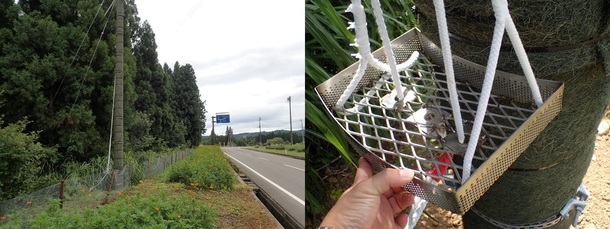 つるつるした表面のコンクリート柱を自由に上り下り出来るように、土木資材の吸出し防止マットを巻き付けました。