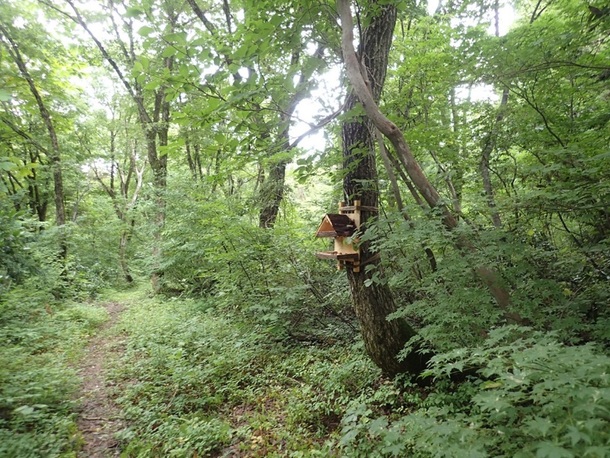 最初は地上から1mのレベルに。二ホンリスがこの餌台を認知したら、徐々に地上からのレベルを上げて、移動路に近づけます。