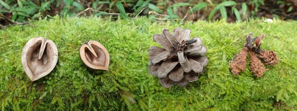 二ホンリスが生息している証拠として、大好物のクルミやマツの食べ痕が森に落ちています。