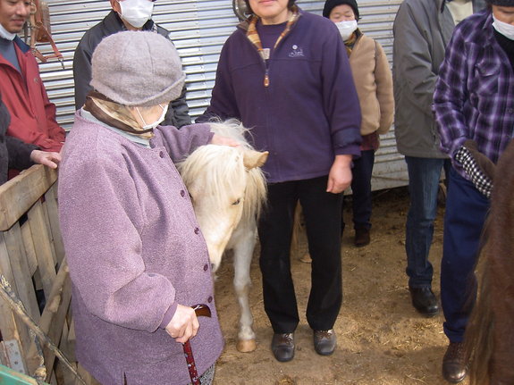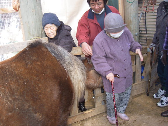 怖いと扉の外側に出た方、だけど懸命に手を伸ばし大介を触っていました。1日中こたつに入りトイレと食事以外は動かない人でしたが、動物と触れ合うようになってから変わりました。こたつに入っている時間が少なくなり動物と触れ合っている時間が延び散歩にも行くようになったと聞いています。大介は興味津々でにおいをクンクンと臭ってました。犬と同様、馬も興味のあるものや始めて見るものなどは確認する意味でにおいを嗅ぎます。症状はさまざまですが痴呆を抱えた方たちの訪問でした。訪問後、問題行動がなくなっていた、馬の話をして興奮気味だが明るい表情になった、顔の表情が変わりしっかりとした顔つきになった、痴呆の症状が軽くなったと聞きました。100%ではないけど、アニマルセラピーは痴呆の症状を軽くすることを実感した。みなさんも機会があったら痴呆を抱えた方たち(動物嫌いは別)に犬や猫ちゃんとの触れ合いを試してみてくださいね。ドイツでは処方箋に乗馬とかホースセラピーと書かれ医療の一環になっています。日本はまだまだですね・・・・