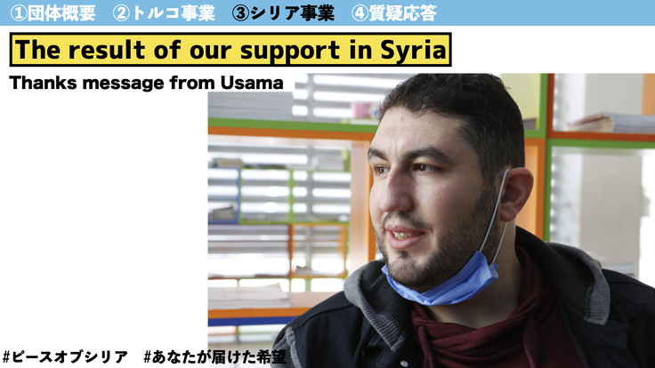 ★オンライン報告会:トルコ在住からシリア国内への支援を実施するパートナーNGO代表ウサマとオンラインで報告会を実施します(アーカイブ有)。シリアの子どもたちの授業の様子や、子ども達からの感謝のメッセージを動画でお届けします。