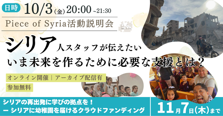 あなたの応援が生んだ変化をお伝えします!【10/3 シリア人スタッフ登壇&10/9 支援者交流会】