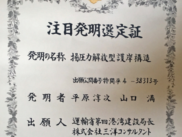 第四港湾建設局長からはその有効性が実証されたとして表彰を受け、国務大臣 科学技術庁長官から注目発明選定証を授与され、「揚圧力開放型護岸構造」は国有特許となりました。