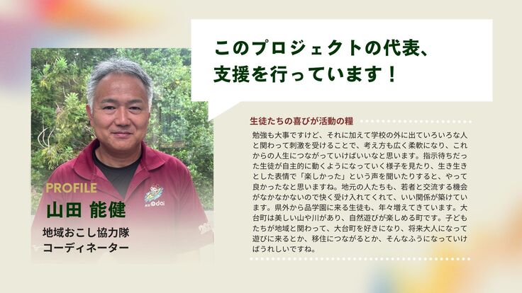 私は、地域おこし協力隊として、大台町企画課の「昴学園魅力化プロジェクト」に取り組むため、大台町に移住して10年になります。