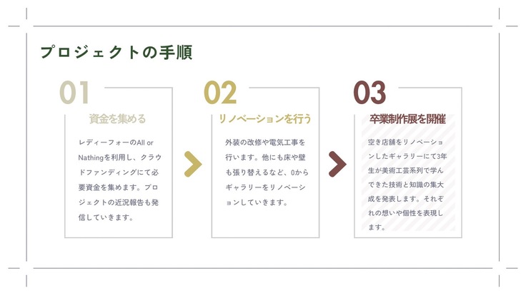 プロジェクト成立後、天災等やむを得ない事情(緊急事態宣言などコロナウイルスによる影響を含む)により2025年1月の美術工芸系列展が開催できなかった場合、webによる作品の展示を行います。いただいた支援金は、主にリノベーションに使用しておりますので、返金は致しません。