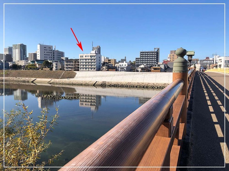 ↑新店舗前には旭川が流れています。「鶴見橋」を渡ると岡山後楽園です。