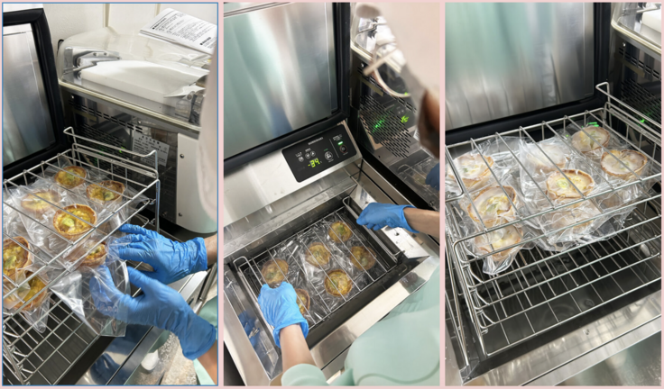 左から、個包装のミニキッシュをカゴにセット、−30度のアルコール液の中に沈め、30分ほどで完了。