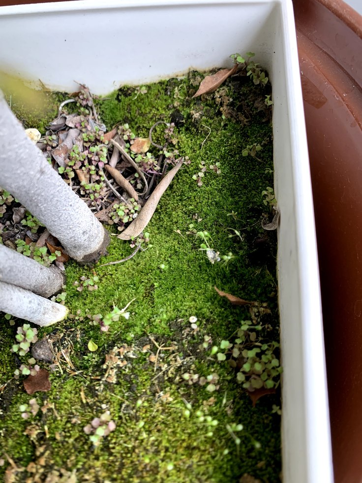 この写真は、ベランダの植物に苔が生えているのに気が付かなかった、、