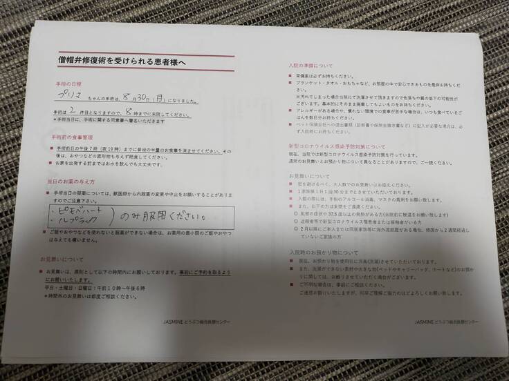 疑う訳ではないのですが、普段から良くしてくれている先生ではなく、違う先生ならもしかしてと思い、動物の循環器を見ているらしい病院を調べ診察を受けると、心臓の手術を受ければ今は95%程の確立で治る見込みがあると言われ、それにより15歳位まで生きる事が出来る様になった例を教えて頂き、手術を受ける事への希望を持ちました。