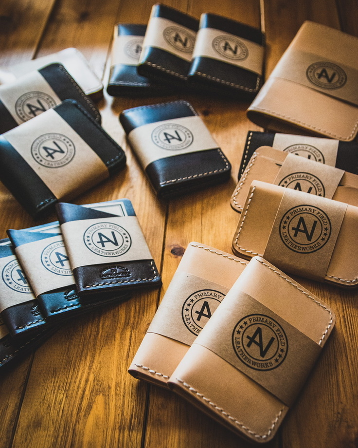 全てのPrimary Fieldのプロダクトが生み出されるまでに、パーツを一つ一つ丁寧に裁断し、しっかりと手縫いする。全ての縁を丁寧に何回にも分けてバーニッシュ(磨き上げ)します。それでこそ初めて「一生使える」本物の革財布が出来上がるのです。