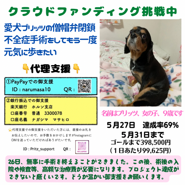 プリちゃんが頑張って手術を乗り越えてくれたから、今度はこっちが頑張る番です。クラウドファンディング、いよいよあと4日。プリちゃんの治療費はまだこれからもたくさん必要になり、用意していた分は手術費用にあてたので、クラウドファンディング達成できないと苦しい状況にあります。必ず達成して、必要な治療をプリちゃんにしてあげられるように、引き続き、より多くの方々から御支援いただけるように発信していきます。