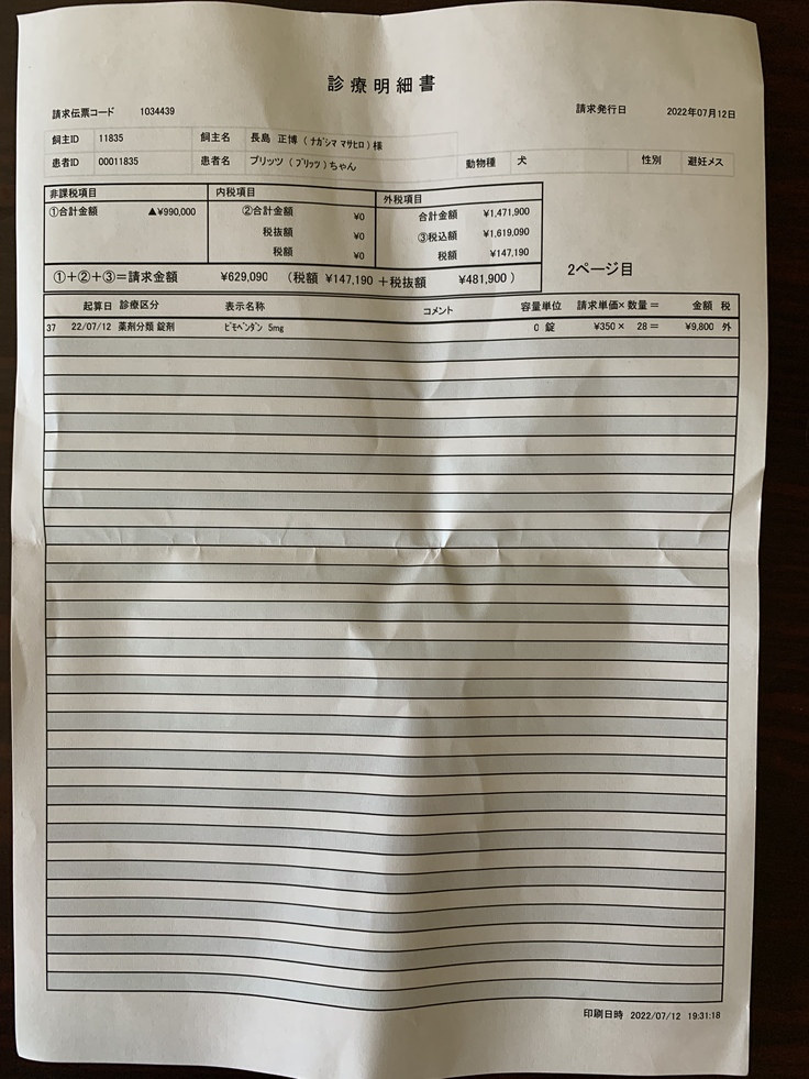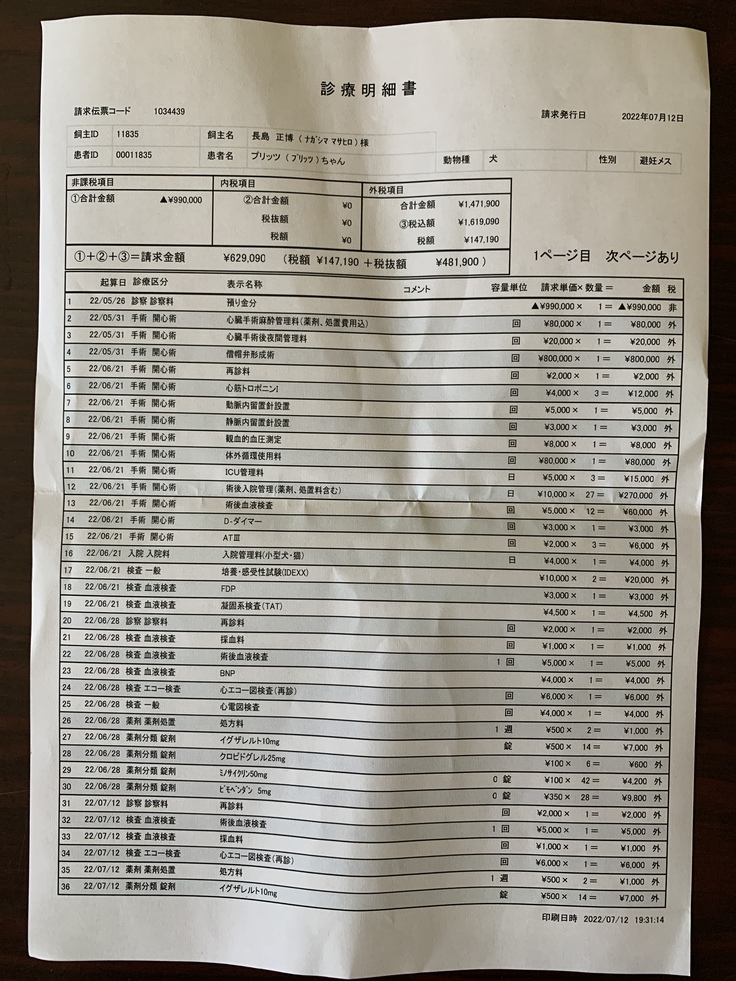 明細書が少しわかりにくいかもしれませんが、手術費用と術後費用の総額が1,619,090円で、手術費用の99万円分は前納していたので、残りの629,090円をこの日にお支払いしました。