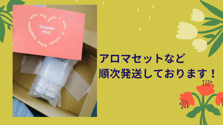 アロマセットも一つ一つ丁寧に梱包し、送付手続き完了いたしましたので、まもなく皆様のお手元に届くかと思います。