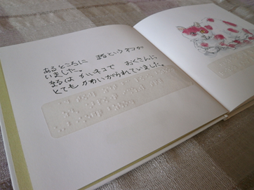 『通常の点訳絵本は絵の形取りをして、物体の名前をそのシートに打ち込むものが多いのですが透明なシートとはいえ今村さんの素敵な絵を汚すような気がして、それはしませんでした。絵を想像してもらう手がかりとして、過不足無く かつ主観を入れない説明文を添えています』