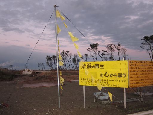 「ここに帰りたい」という住民の想いが書かれた旗が相変わらず海岸線に続き、