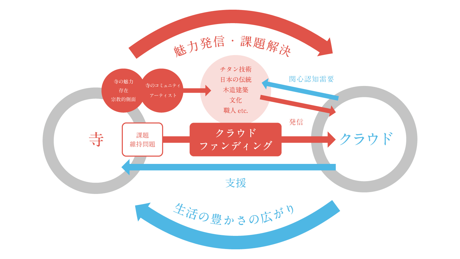 お寺は資金援助を得ることによって課題を解決しまた支援者の皆様と結んだご縁により、今までお寺が気づいてきた歴史と文化を支援者の皆様に提供する。相互にメリットがある関係性を築くことが出来るのがクラウドファンディングであると考えています。クラウドファンディングサイトREADYFORは私たちが社会に対して発信する最適なツールです。