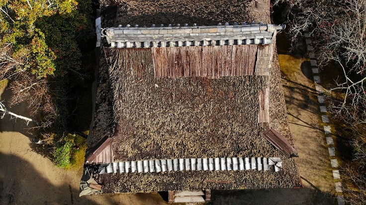 この唐門は、写真家の水野克比古先生の写真で有名になり、一休寺を代表する景色となっています。これまでは檜皮で葺かれていましたが、長年の風雨により損傷が激しく、新たな屋根が必要とされています。