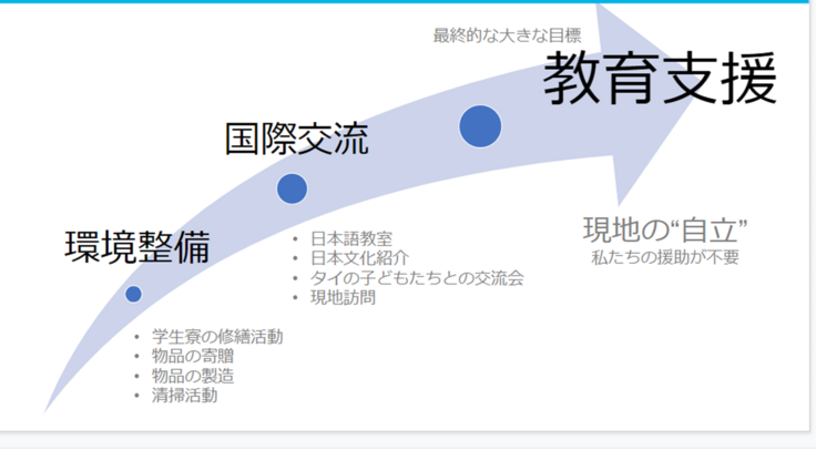 初めは4泊5日での教育ボランティアのプロジェクトに参加しました。そこで、不十分であり不衛生な寮の設備とその生活基盤の軟弱さからくる教育の質の低下に衝撃を受けた先代のメンバーが、自分達学生も何か支援できないかと試行錯誤し、自らタイのボランティアコーディネーターへと連絡を取り教育支援を始めました。