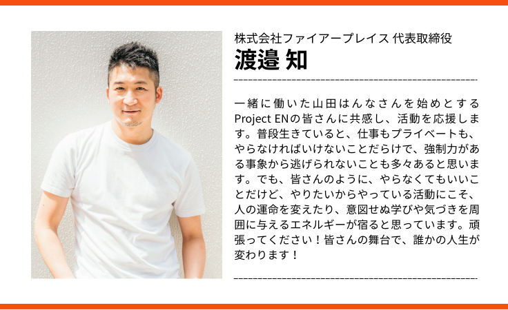 【応援メッセージ vol.5】株式会社ファイアープレイス 代表取締役 渡邉 知さん