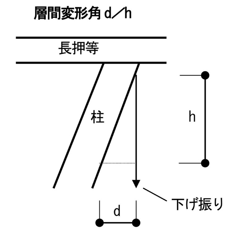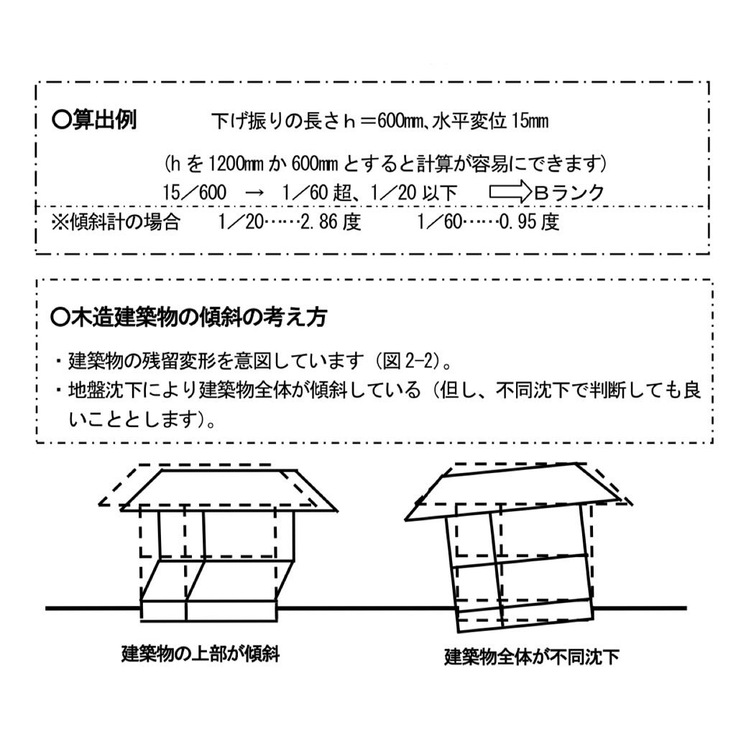 因みに応急危険度判定でのマニュアルでは、高さh/水平変異長さd=1/60以上の傾きがあれば早急な危険性はありませんが要注意、1/20以上の判定では危険とされています。