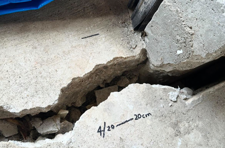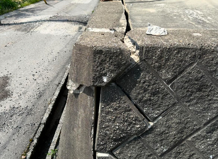 盛り土を留める擁壁や石垣が道路側に押し出され、宅地内に地割れが発生しているお宅が山すそに多いようです。地割れが毎日開いているのではと気にされていたので、定点観測用に20cmのラインと日付を書きました。柱の傾きも下げ振りを設ければ定点観測できます。