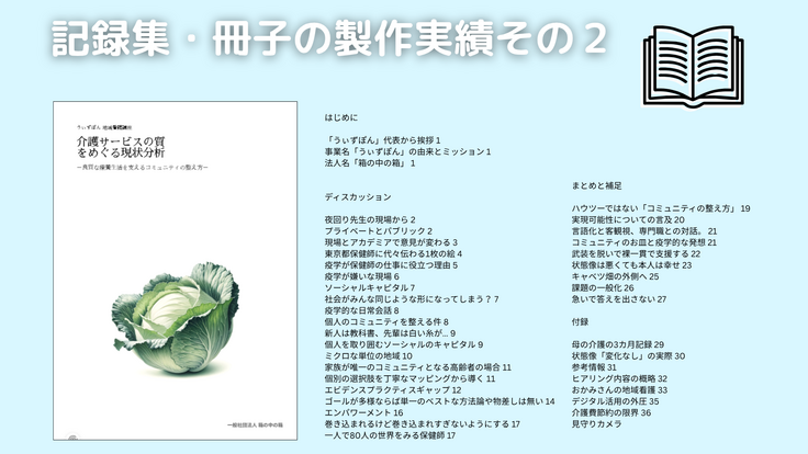 2023年から2024年にかけて、私たちはある試みに取り組みました。現場で見えてくる一つひとつの出来事や課題を、畑に並ぶキャベツにたとえ、「自分はいま“畑のキャベツ”かもしれない。でも、ときには畑の外から全体を見る視点も大切だよね」と。そんな思いから生まれたのが、対話をもとに編集した36ページの小冊子です。この冊子では、介護サービスの質をめぐる現場の状況を、公衆衛生看護や疫学的視点からひもとき、専門家の対談と資料を、イラストを交えてわかりやすくまとめました。正式名称は『うぃずぽん地域看護講座:介護サービスの質をめぐる現状分析 ― 良質な療養生活を支えるコミュニティの整え方 ―』。業界内では「キャベツ畑」の愛称で親しまれ、予想を超える反響をいただきました。現在は改訂・再販の企画も進んでいます。このプロジェクトで作るまんが冊子も、このような経験の積み重ねを土台にして、またはシナジーとして活用して、編集を進めていきます。よくある浅いハウツー本や、難しく気取った自己啓発本のようなものではなく、きちんとした専門家、陰ながら目立たず活躍している人、心ある良識人たちのアドバイスを受けながら製作します。映画から始まる学びを、楽しく、そしてしっかりと伝わるかたちで届けるためにも、ご理解とお力添えをお願いいたします。