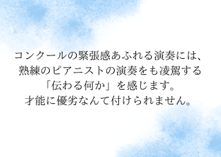 ファイナルで演奏予定の協奏曲から指定楽章をピアノ伴奏で競演、