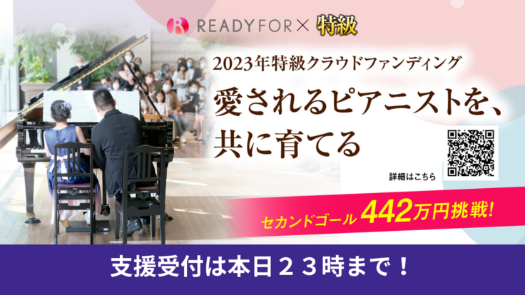クラウドファンディングは残り1時間となりました。頂きましたご寄付で、ピアニストの活動サポートをさらに充実させることができます。クラウドファンディングも皆さまの想いとともに駆け抜けたいと思いますので、最後の瞬間まで温かく見守っていただけますと幸いです。