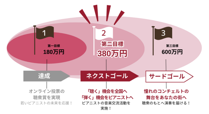 現在挑戦している第二目標380万円の達成まであと152万円。第二目標までにいただいたご支援金は、ピアニストの音楽交流活動のために活用されます。