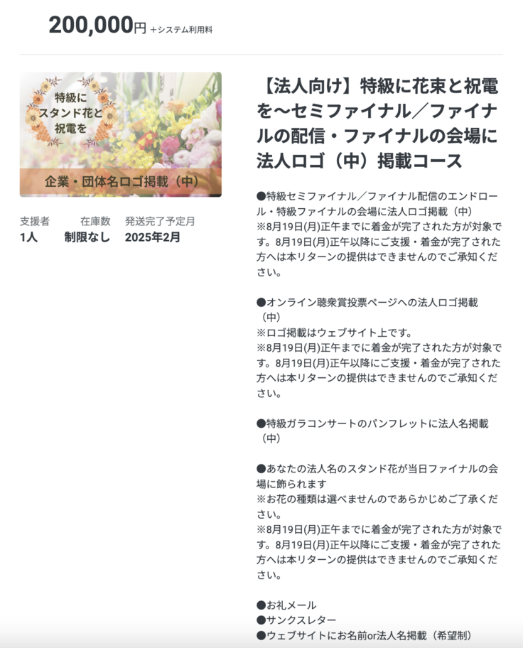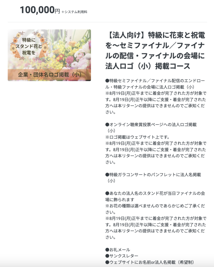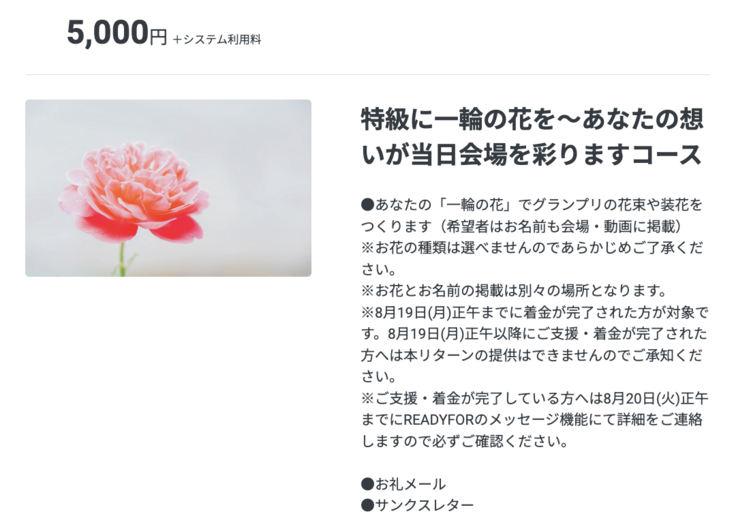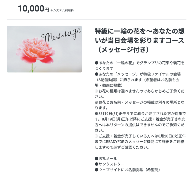 ※5,000円の「特級サポーターからファイナリストへ花束を」コースと内容は同一です