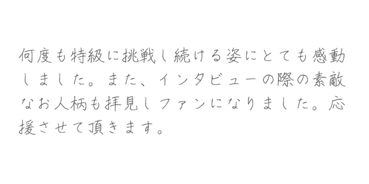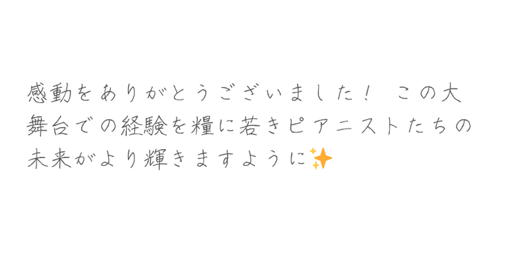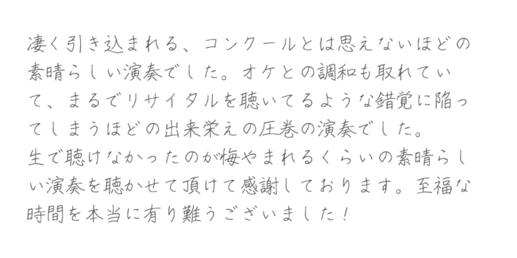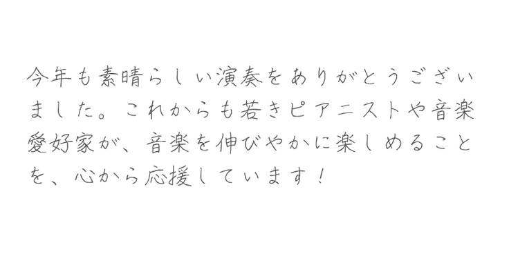 早いもので去年に特級を受けてから約1年が経ちました。特級の夏が終わってからの1年は、有難いことにたくさんのコンサートに出演させていただく機会を頂きました。そのおかげで色々な場所、ピアノにも触れられ、たくさんの方々との出会いもありました。また温かく見守ってくださるお客様と直接お話できたりすることも、とても励みになり嬉しかったです。これから成長していく上で本当に貴重な経験をたくさんさせて頂いた一年だったと思います。これらの経験をいかして今後もしっかりと音楽に向き合っていきます。本当にありがとうございました。