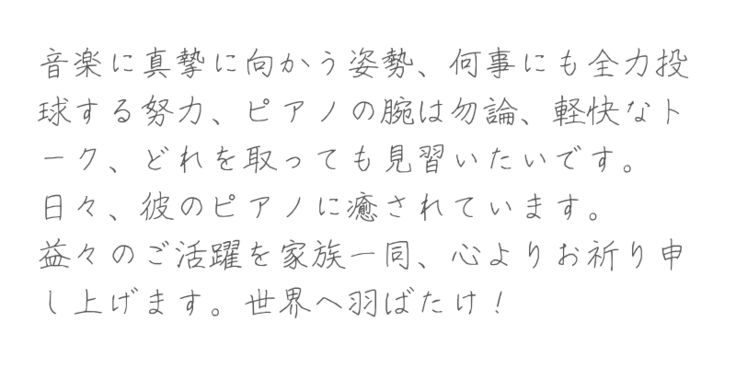 全国各地で、若きピアニストとの交流が更に広がりますよう、微力ながら応援させていただきます。