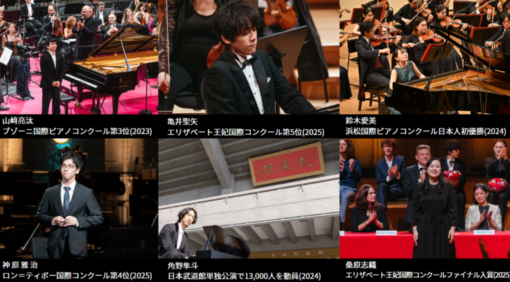 今回のプロジェクトではご支援によってピアニストの国内外での活動サポートが実現しますが、実際に2024年度は32公演・17地域(うち海外1カ国)にピアニストを派遣いたしました。そうした経験を経て、これまでも多くの受賞者たちが国内外で大きな活躍をみせています。