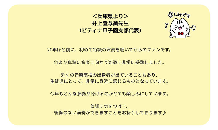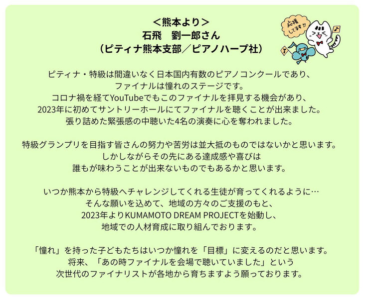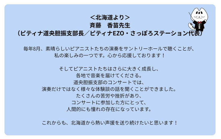 ピアニストも聴衆も、自身の出身地域の特産が載っていればもちろん嬉しいですし、ご縁のなかった様々な地域からも応援の声があることを感じられることは、大きな励みになります。