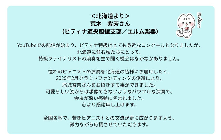 こんにちは。ピティナ特級クラウドファンディング事務局です。