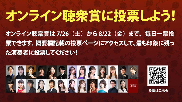皆様のお力添えにより、今年の「オンライン聴衆賞」の賞金授与が無事実現することとなりました。本日より10日間、25名のコンテスタントにご投票いただけます。ピアニストたちへ、あたたかなエールをぜひお寄せください。