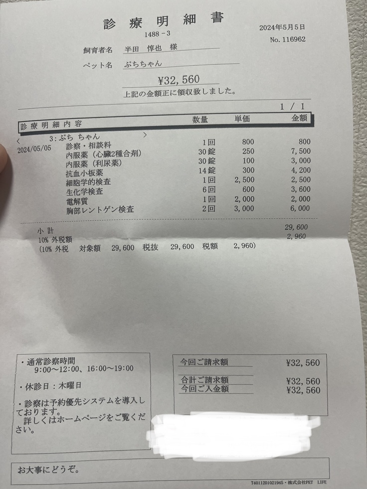 レントゲンの結果は、相変わらず心臓は大きいけど、肺はスッキリしているので肺水腫の再発は無さそうで良好ですね。とのこと。