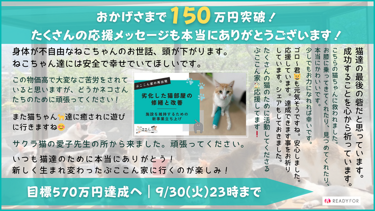 8月13日(水)からスタートした『心や体に傷を負い行き場を失った猫たちの『いのち』を最期まで守る為に』プロジェクトですが、おかげさまで150万円を突破いたしました!