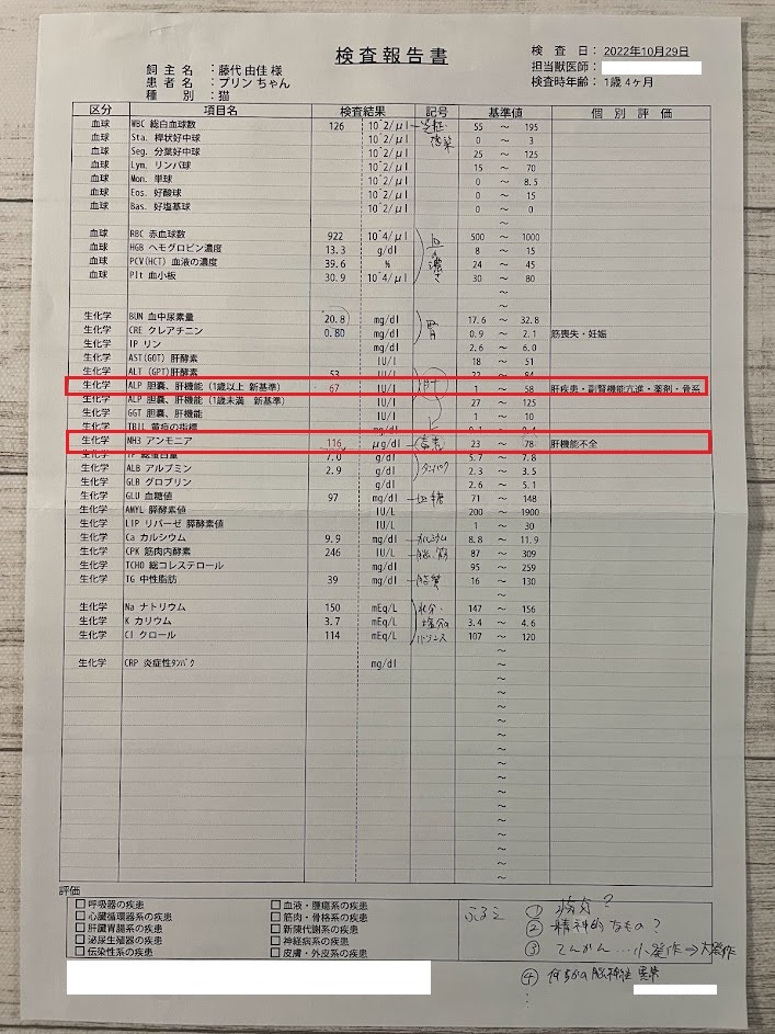 2022年10月29日:病院にて超音波・血液検査実施、アンモニアと肝臓に関連する数値に異常。
