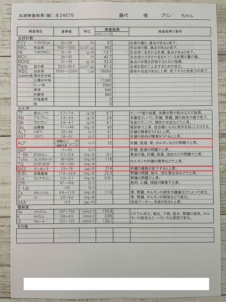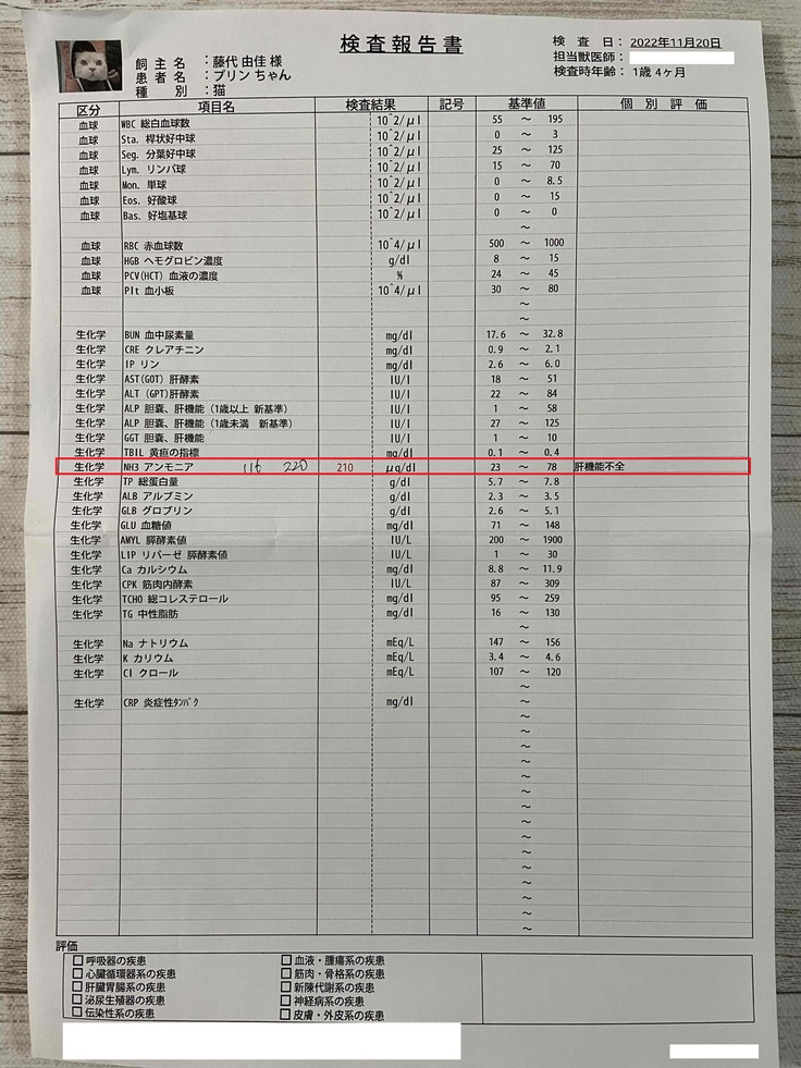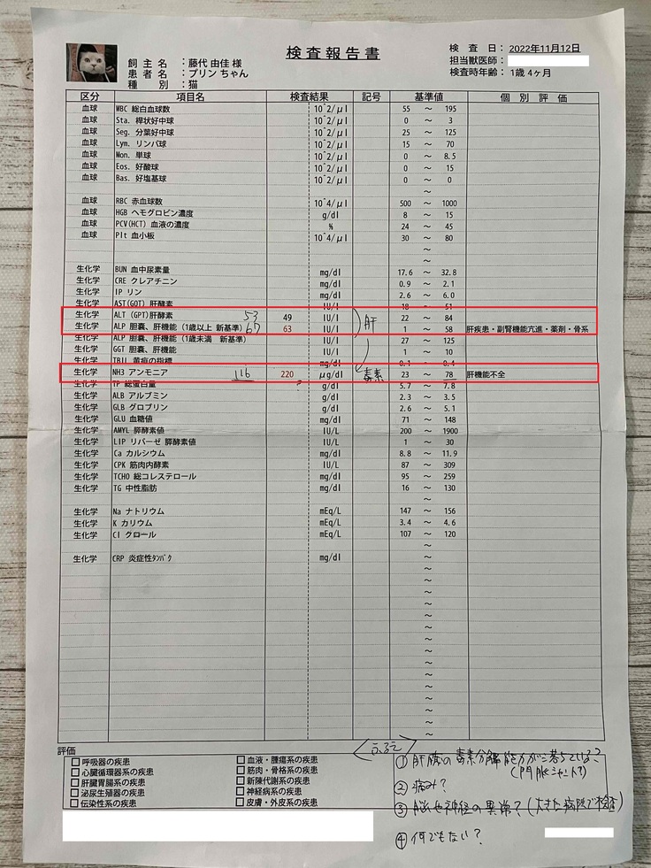 超音波では異常はありませんでしたが、血液検査にて、ALPという肝臓に疾患がある時の数値と、身体に毒素があると上がる、NH3(アンモニア)の数値に異常がありました。