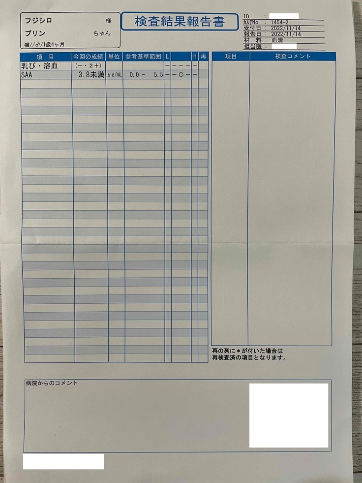 前回同様に血液検査と、SAA(糖尿病)の検査をしてもらいました。
