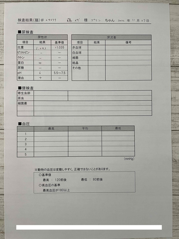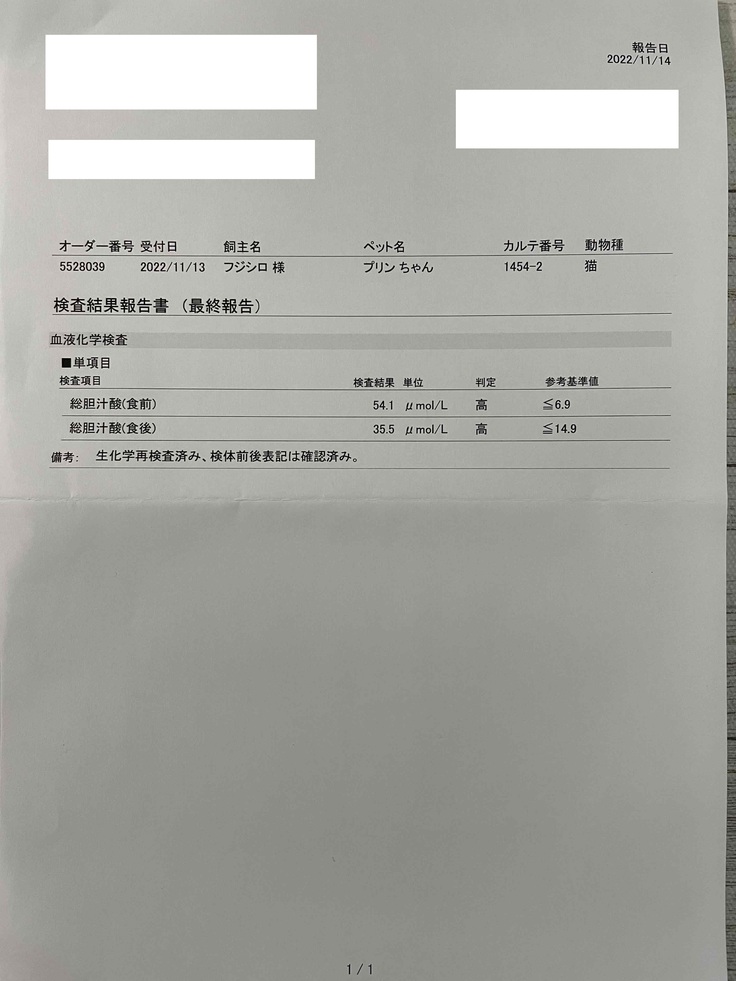 2022年11月12日:再診、血液検査2回目に加え、尿検査実施。投薬してもアンモニアと肝臓の