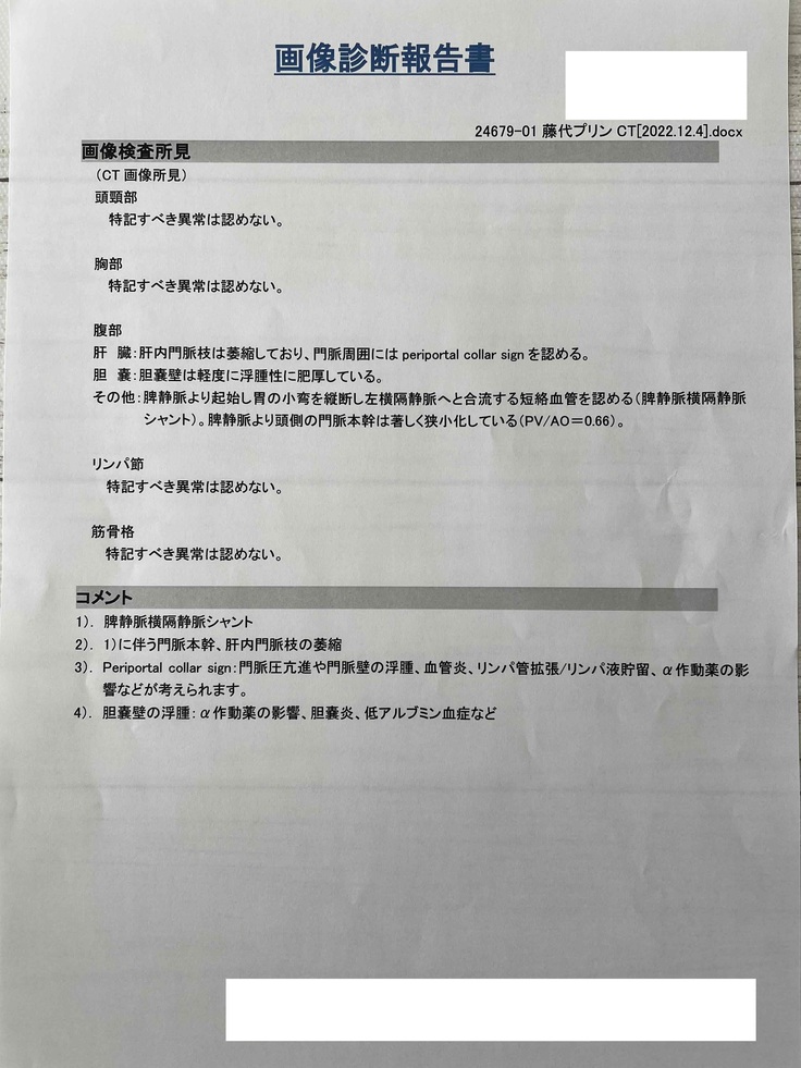 11月27日の診察で門脈シャントの可能性が高いとは言われましたが、一縷の望みにすがり当日のCT検査を受けました。その日の朝食は抜き、朝10時病院に預け、18時に迎えに行きました。結果