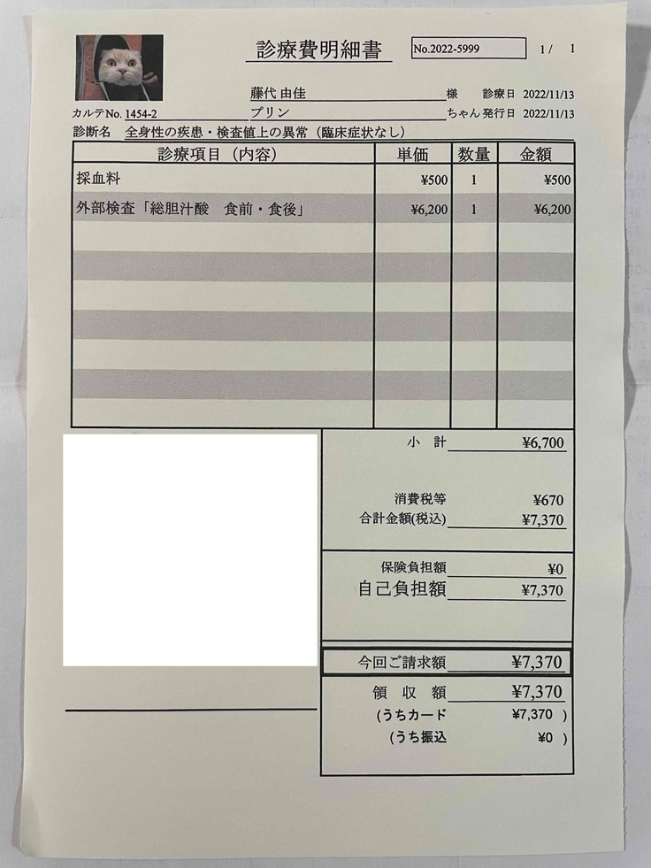 かかりつけの病院で診察を受けました。血液と超音波断層の検査を実施してもらいました。