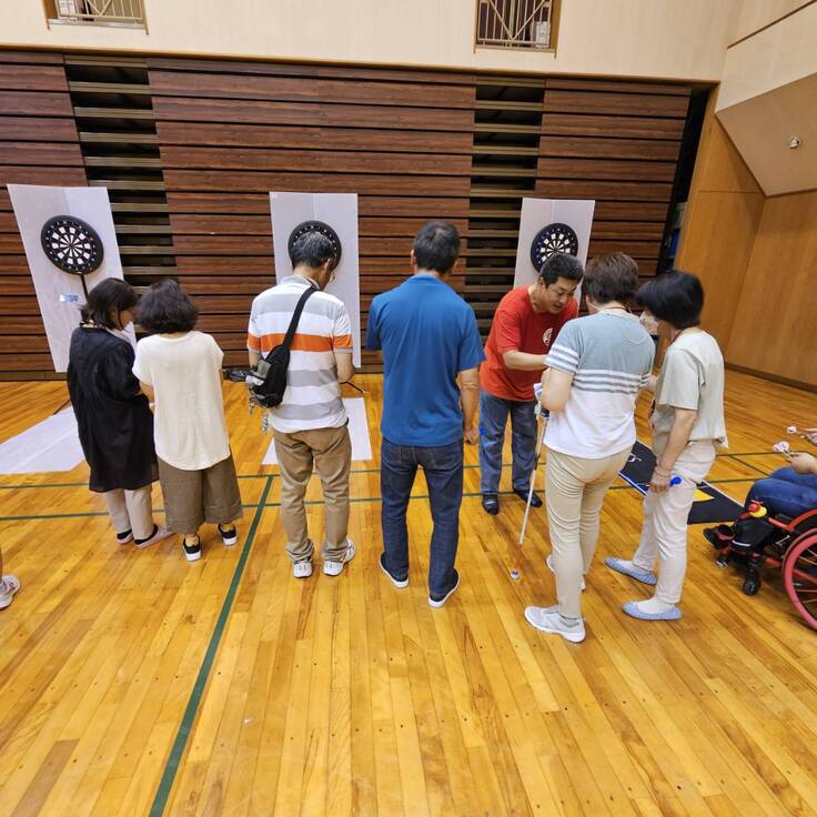先日サマーボランティアスクールで体験に来てくれた中学生ボランティアさんと、さまざまな障がいのある方たちと一緒にダーツを楽しんでもらうことができました。