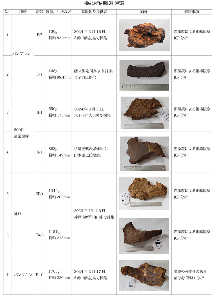 以上示したように、パンプキン爆弾は、私たちが去る2月に和歌山県有田市で採取した破片と愛知県鷹来製造所跡から採集された破片を使う予定です。通常爆弾については、東京都八王子市の犬目山で私たちが採取した、500ポンド通常爆弾の破片と宇治山田(現在の伊勢市)の着弾地から得られたものを使う予定です。