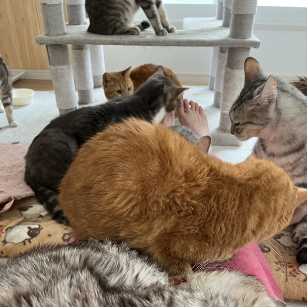 昼間猫部屋に入って足を伸ばすと瞬く間に埋もれました😑