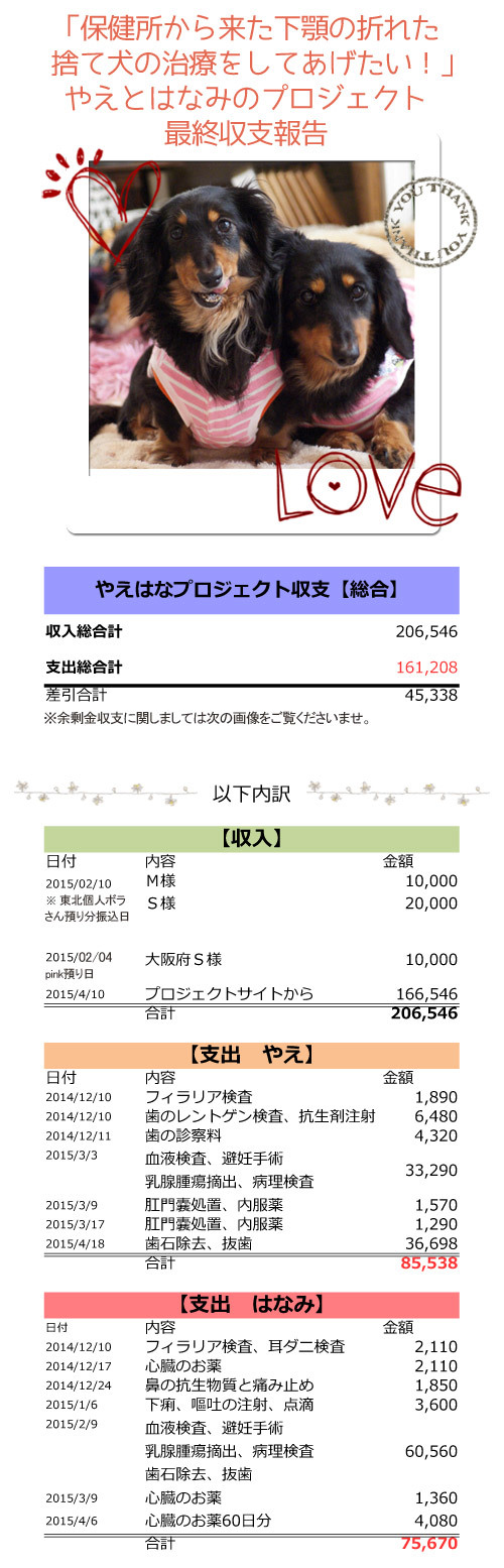 頂きましたご支援は全て、やえとはなみの医療、治療費に使用させて頂きましたが収支もしくは使用目的にご不満な点がございましたらご返金させて頂きますので、お手数をお掛けしまして恐れ入りますが下記迄ご連絡頂けます様宜しくお願い申上げます。