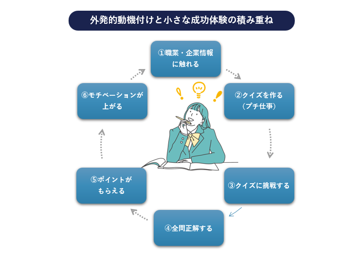 「クイズで全問正解することでポイントを付与する」ということは、外発的動機付けになります。