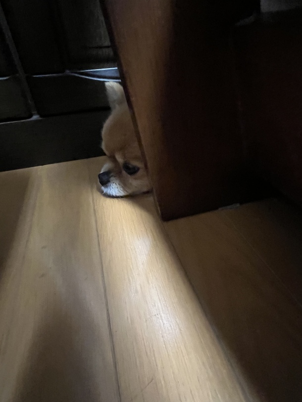 どこに行ったかと思ったら、椅子と本棚の隙間から、顔を覗かせていました。